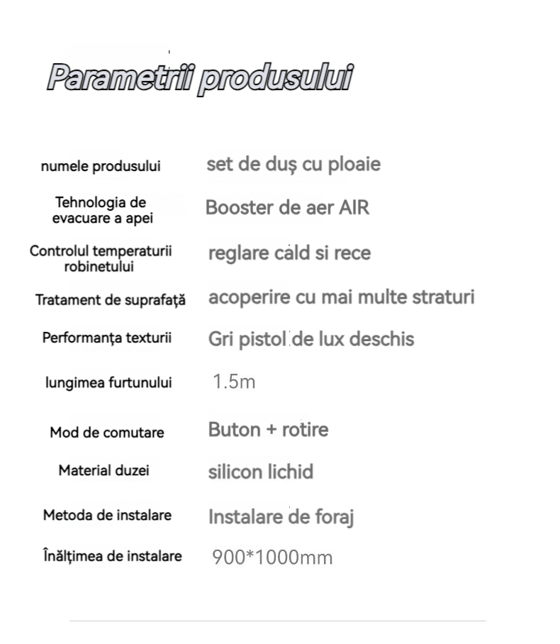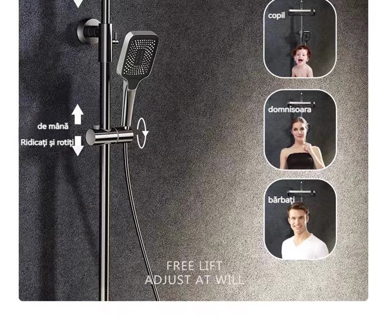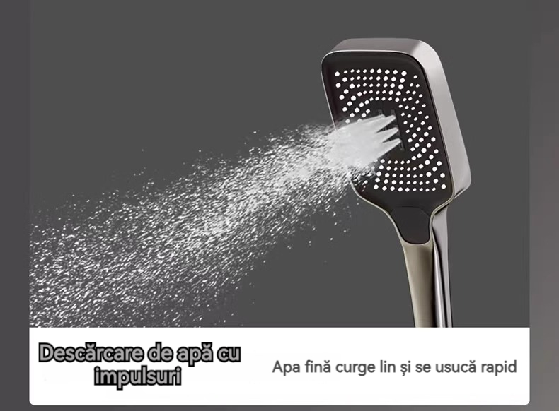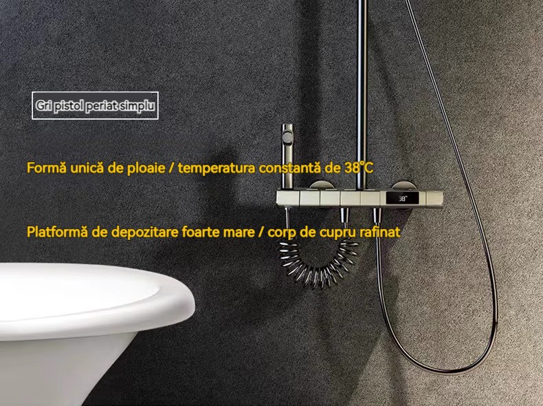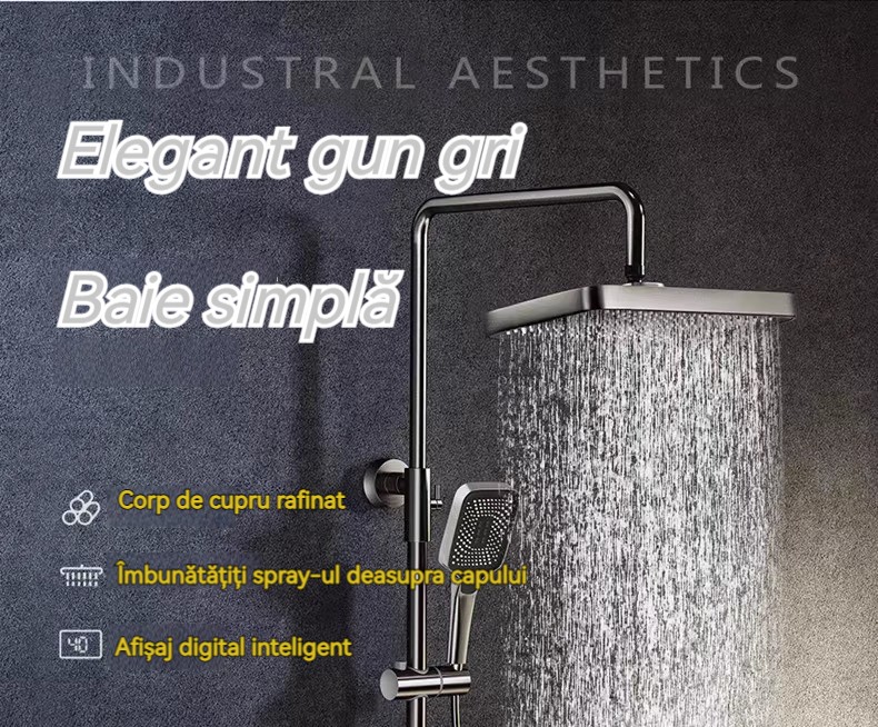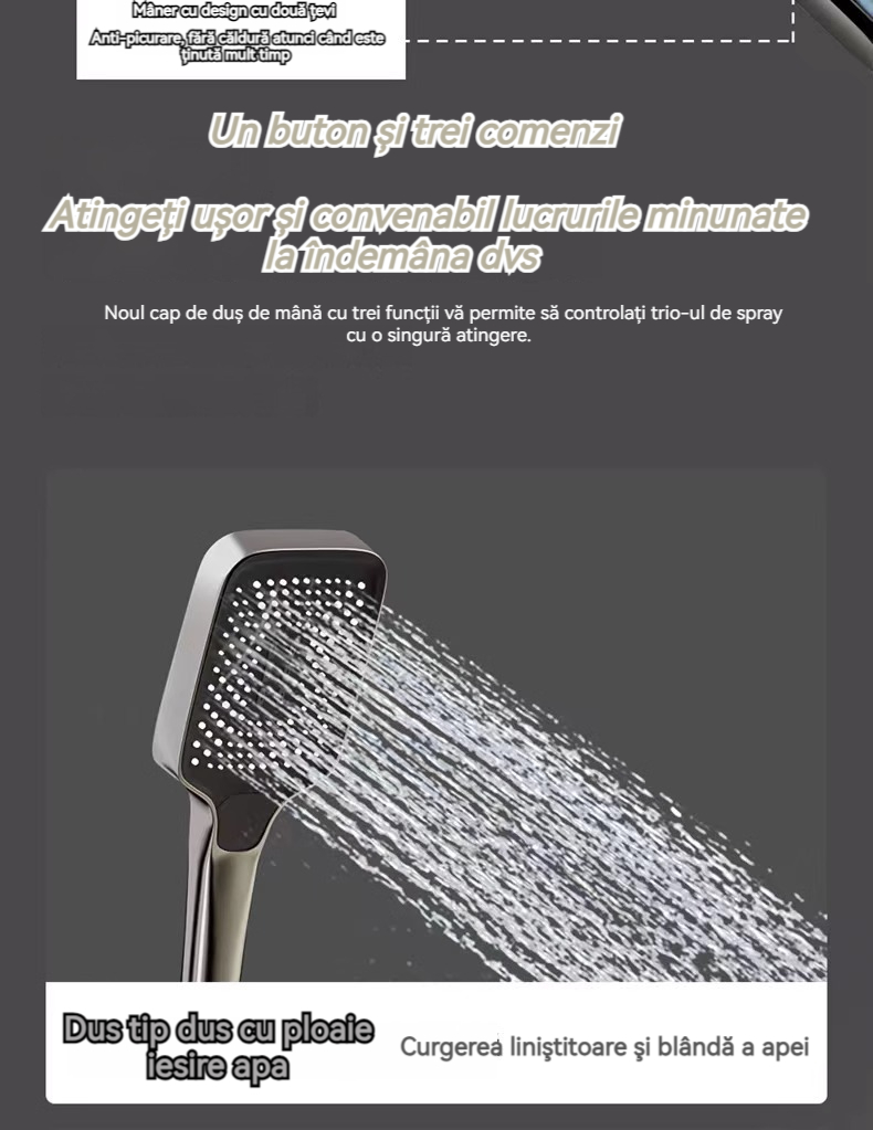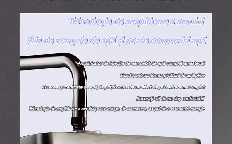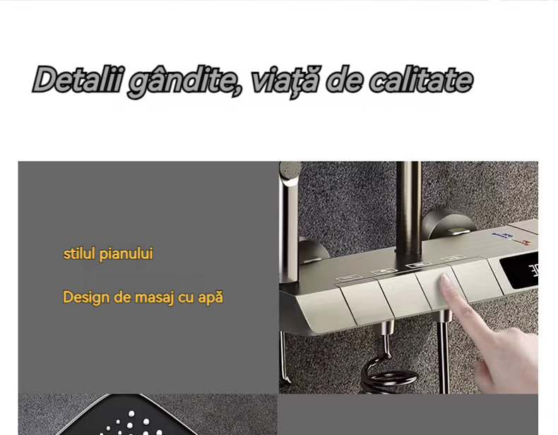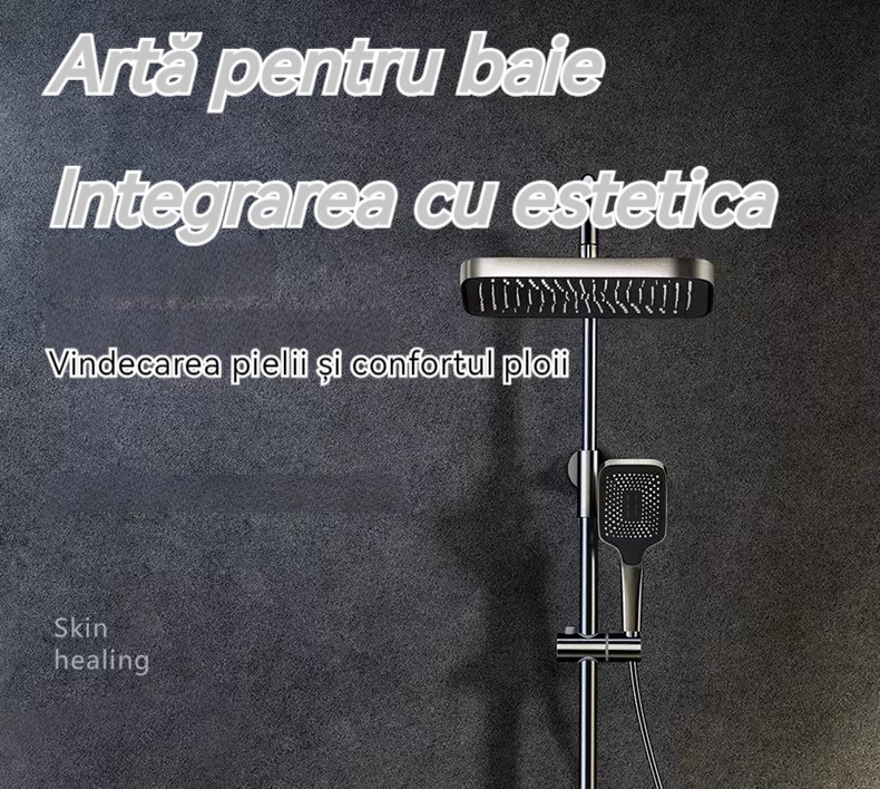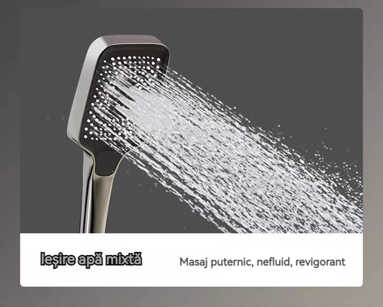 Minimalism combinat cu înaltă tehnologie, design al tastelor de pian. Cap de dus cu amplificator de aer, debit mare si fin de apa, corp de dus din cupru fin, control precis al temperaturii, potrivit pentru orice varsta. Garanție pe viață, ușor de instalat