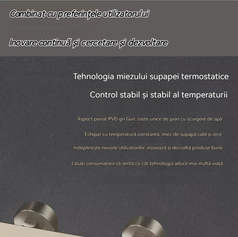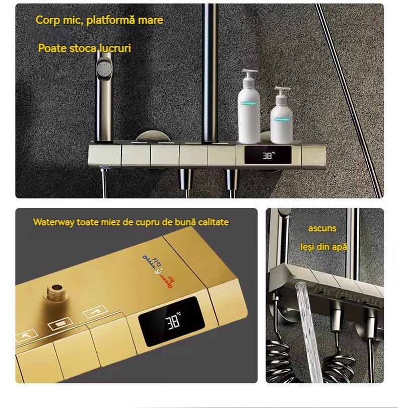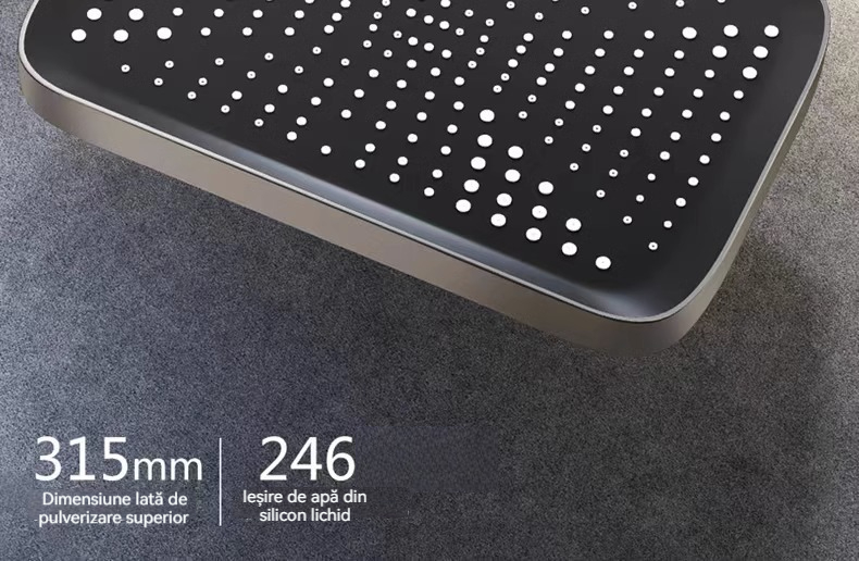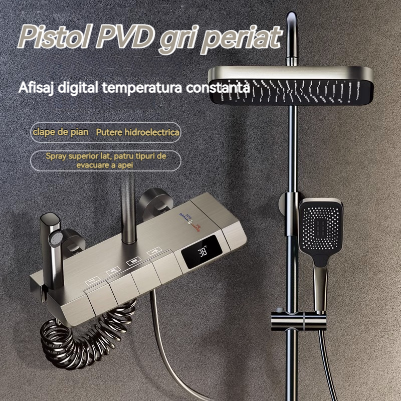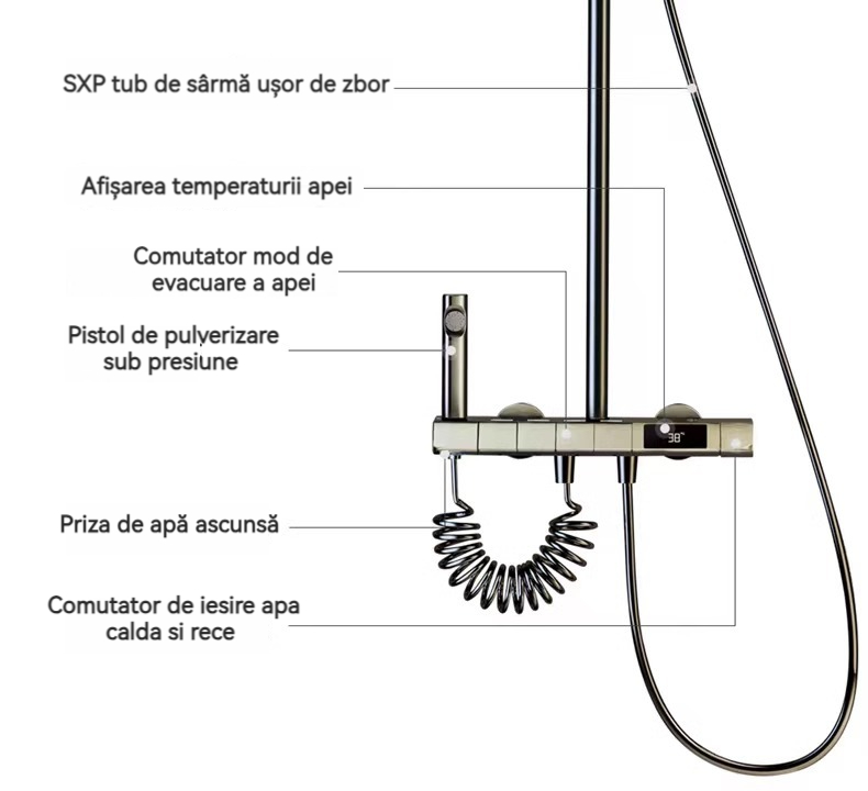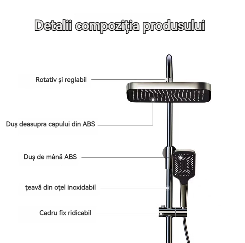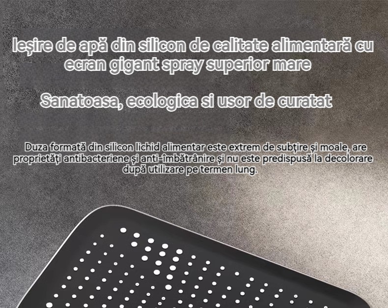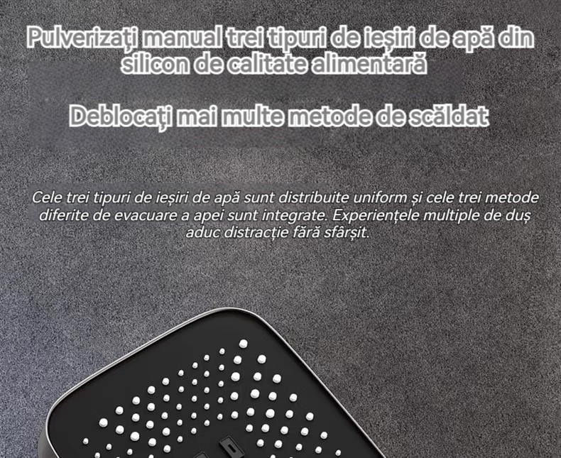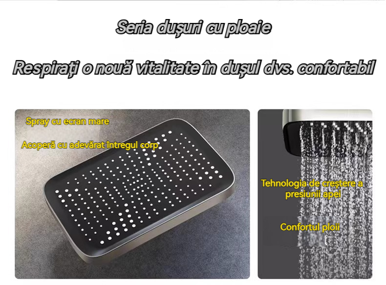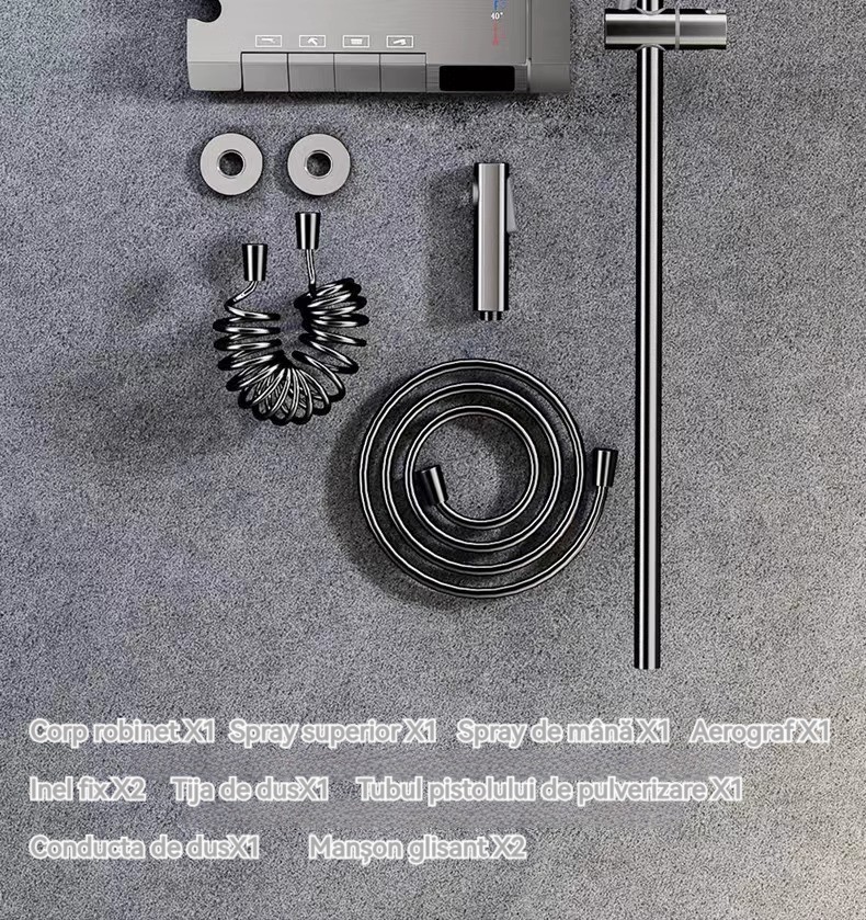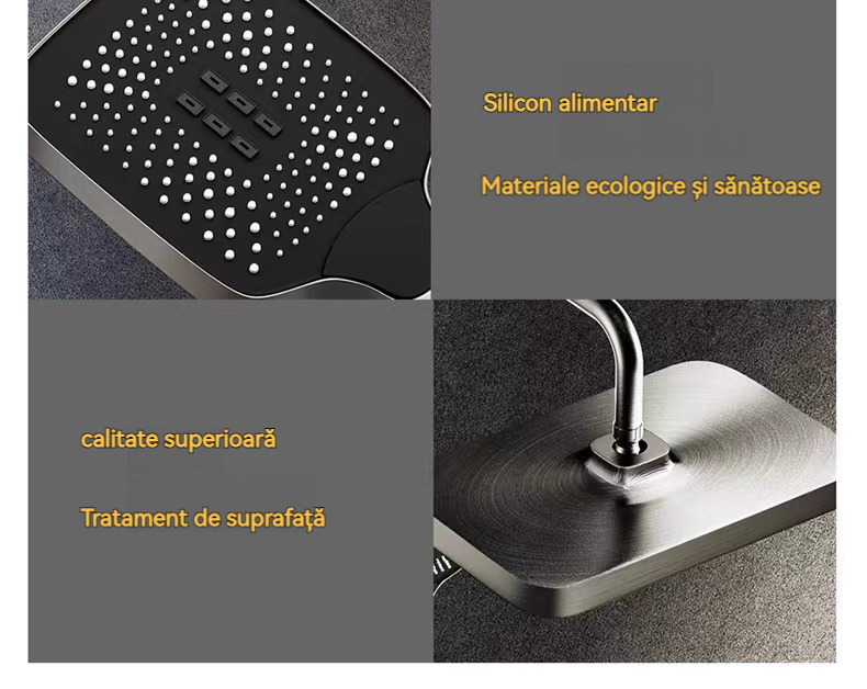 Minimalism combinat cu înaltă tehnologie, design al tastelor de pian. Cap de dus cu amplificator de aer, debit mare si fin de apa, corp de dus din cupru fin, control precis al temperaturii, potrivit pentru orice varsta. Garanție pe viață, ușor de instalat